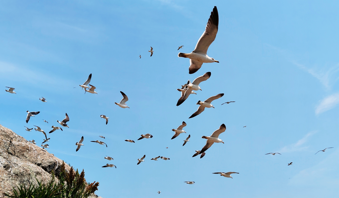 在鹿西島東北面的海域上,點綴著兩座“懸海小島”,即北爿山嶼、南爿山嶼。遠遠望去,看似平平無奇。但若來到近前,一幅生機勃勃的景象便會躍入眼簾:峻峭奇突的礁巖,水天一色的碧海晴空,數以萬計的海鳥在海天間“舞蹈”,或高或低,或近或遠,有的成群矗立礁石、有的結伴浮水嬉戲、有的隨風振翅翱翔,鳥鳴此起彼伏、不絕于耳。
